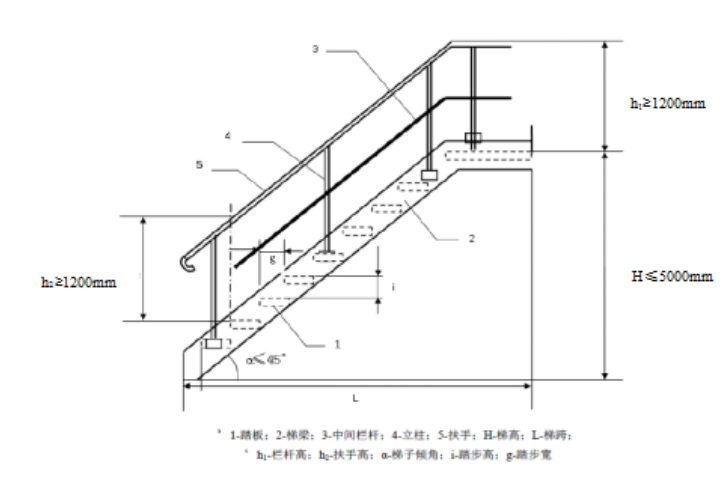 参考《固定源废气监测技术规范》(HJ/T 397—2007)、《固定污染源烟气(SO2、NOx、颗粒物)排放连续监测技术规范》(HJ 75-2017)等相关监测技术规范,对废气排放监测平台建设作如下要求,各排污单位应结合采样口开孔规范,选择合适的位置建设监测平台并安装符合安全要求的监测梯。 一、监测开孔要求 1.对于颗粒态污染物,监测断面优先设置在垂直管段,应避开烟道弯头和断面急剧变化的部位,设置在距弯头、阀门、变径管下游方向不小于4倍直径(或当量直径)和距上述部件上游方向不小于2倍直径(或当量直径)处。对矩形烟道,其当量直径D=2AB/(A+B),式中A、B为边长。在选定的监测断面上开设监测孔,监测孔的内径应≥ 90mm。监测孔在不使用时应用盖板或管帽封闭,使用时应易打开。 2.烟道直径≤1 m的圆形烟道,设置一个监测孔;烟道直径大于1 m且不大于4 m的圆形烟道,设置相互垂直的两个监测孔;烟道直径>4 m的圆形烟道,设置相互垂直的4个监测孔。 3.当CEMS安装在矩形烟道时,若烟道截面的高度> 4m,则不宜在烟道顶层开设参比方法采样孔;若烟道截面的宽度>4m,则应在烟道两侧开设参比方法采样孔,并设置多层采样平台。在CEMS监测断面下游应预留参比方法采样孔,采样孔位置和数目按照GB/T 16157的要求确定。现有污染源参比方法采样孔内径应≥80mm,新建或改建污染源参比方法采样孔内径应≥90mm。在互不影响测量的前提下,参比方法采样孔应尽可能靠近CEMS监测断面。当烟道为正压烟道或有毒气时,应采用带闸板阀的密封采样平台。 二、监测平台要求 1.监测平台的台面应在采样孔下方1.2~1.3m。 2.距离坠落高度基准面0.5m以上的监测平台及通道的所有敞开边缘应设置防护栏杆,防护栏杆的高度应≥1.2m,有牢固并符合要求的安全措施,便于日常维护(清洁光学镜头、检查和调整光路准直、检测仪器性能和更换部件等)和比对监测。 3.监测平台的防护栏杆应设置高度不小于100mm,厚度不小于2mm的钢制踢脚板。 4.采样或监测平台长度应≥2m,宽度应≥2m或不小于采样枪长度外延1m,任意边的长度应≥1.2m,且不小于监测断面直径(或当量直径)的1/3。若监测断面有多个监测孔且水平排列,则监测平台区域应涵盖所有监测孔;若监测断面有多个监测孔且竖直排列,则应设置多层监测平台。 5.监测平台地板应采用厚度≥4mm的花纹钢板或钢板网铺装(孔径小于10mm×20mm),监测平台及通道的载荷应≥3 kN/m2。 6.采样平台上应在监测设备附近提供干燥、清洁、无油、无尘、无污染因子成份的反吹气源,气源压力要求在0.6MPa~0.8MPa之间。 7.采样平台上应在监测设备附近布设安全的供电电源,电压要求在198V~242V之间。 三、监测梯要求 1.通往监测平台的路径上,任意位置与坠落高度基准面之间均应保障安全通行,安装易于人员和监测仪器到达的监测梯。 2.监测平台与地面或最近坠落高度基准面之间距离超过2m时,不得使用直梯通往监测平台,应安装升降梯或符合GB 4053.1、GB 4053.2要求的固定式钢斜梯、转梯。当采样平台设置在离地面高度≥20m 的位置时,应有通往平台的升降梯,电梯的安装和安全应符合GB 7588的要求。 3.安装固定式钢梯或转梯时,无障碍宽度应≥0.9m,倾角不超过45度。每段斜梯或转梯的最大垂直高度不超过5m,否则应设置缓冲平台,缓冲平台的技术要求同监测平台。 固定式钢斜梯示意图见下图。