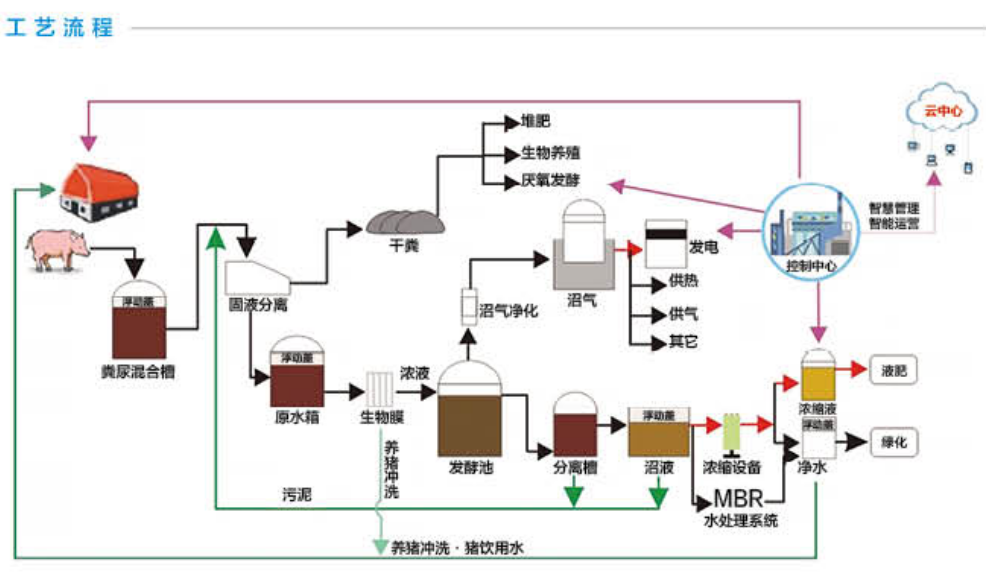 养殖场污水的主要特征是: 养殖污水具有典型的“三高”特征,即有机物浓度高COD高达 3000-12000mg/,氨氮高达800-2200mg/,悬浮物 SS 超标数十倍;可生化性一般;臭味大;色度深,并含有大量的细菌,氨氮、有机磷含量高,冲洗排放时间集中,冲击负荷大,根据该污水的特点,采用生化法+物化的处理方法可以达到很好的处理效果。